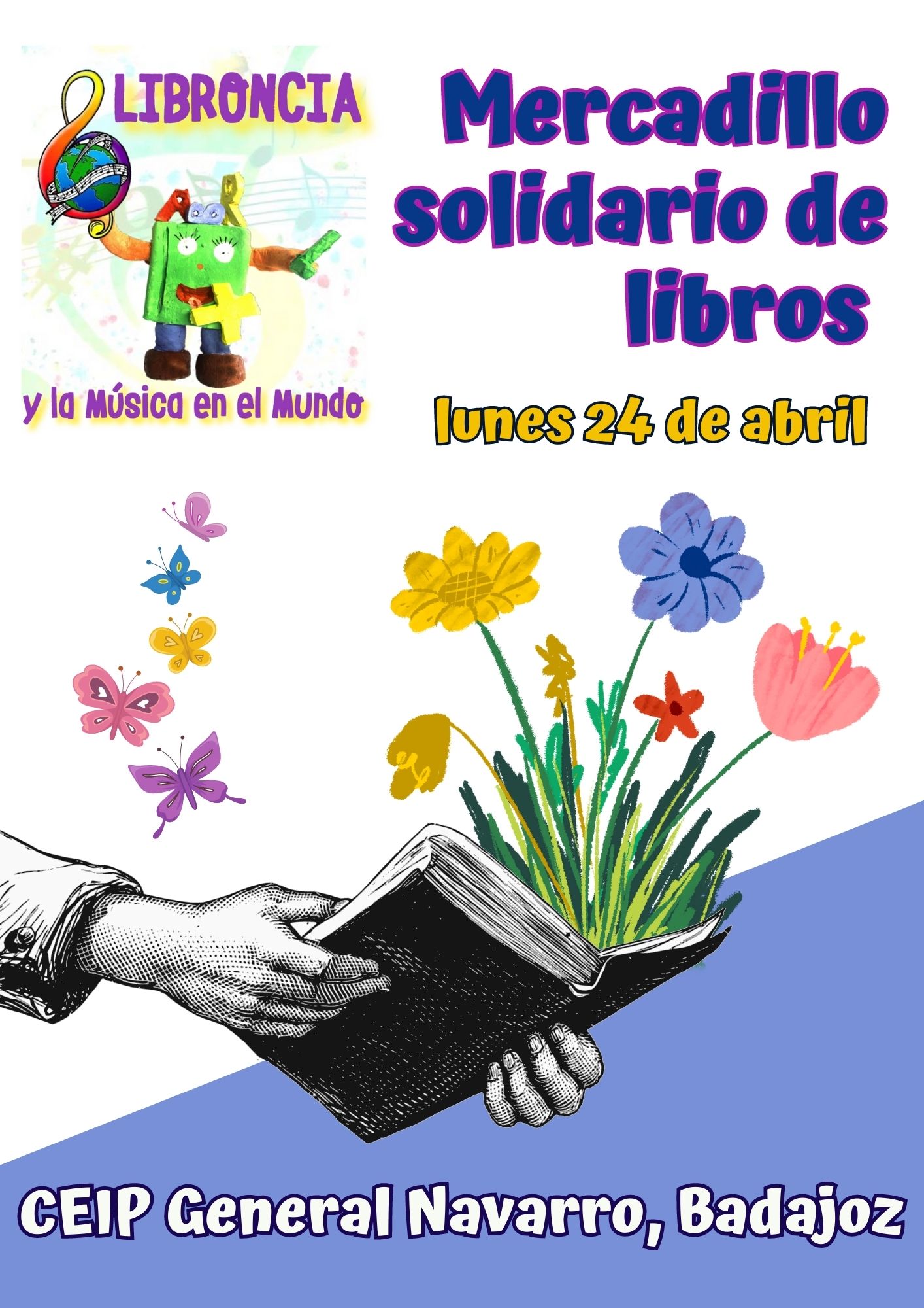 Estimadas familias. El próximo 23 de abril es el Día del Libro y desde el cole queremos celebrarlo con un MERCADILLO SOLIDARIO DEL LIBRO el lunes 24, donde los alumnos/as que quieran participar, desde Infantil de 5 años hasta 6º de Primaria, pondrán poner a la venta libros usados y donados por las familias del Centro. El precio de estos libros rondarán entre 0,50 céntimos y dos euros. El dinero recogido será utilizado para una causa social.